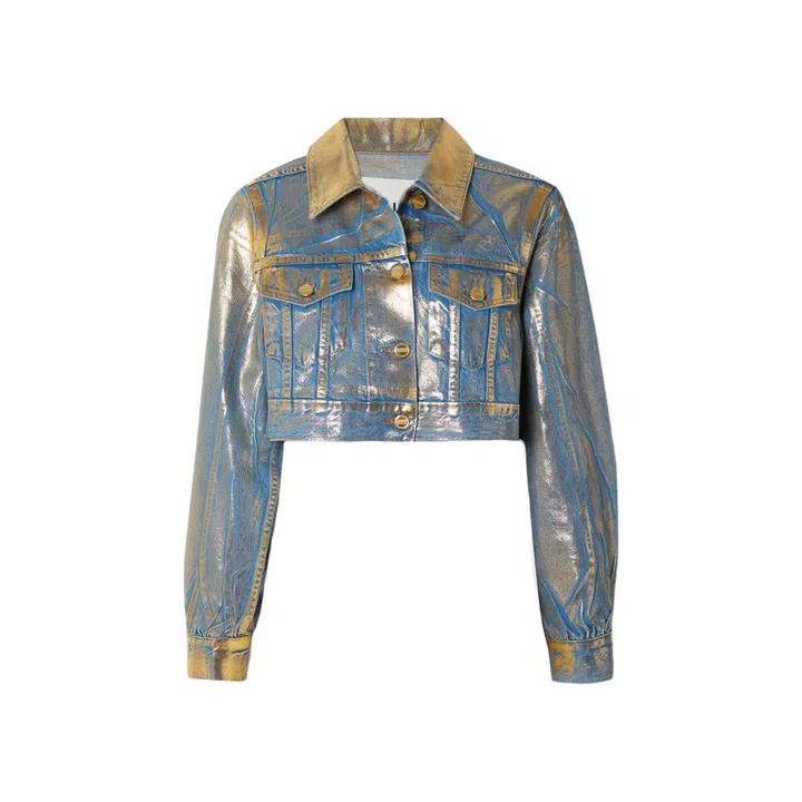 Copenhagen-based label Ganni revamps the time-honoured denim jacket with a shimmery gold accents and boxy fit. If you want to make a bigger style statement, the piece comes with a pair of matching pants.
