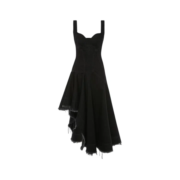 Alexander McQueen's signature grunge aesthetic meets sensuality in this asymmetric black dress that features an exposed back and sweetheart neckline.