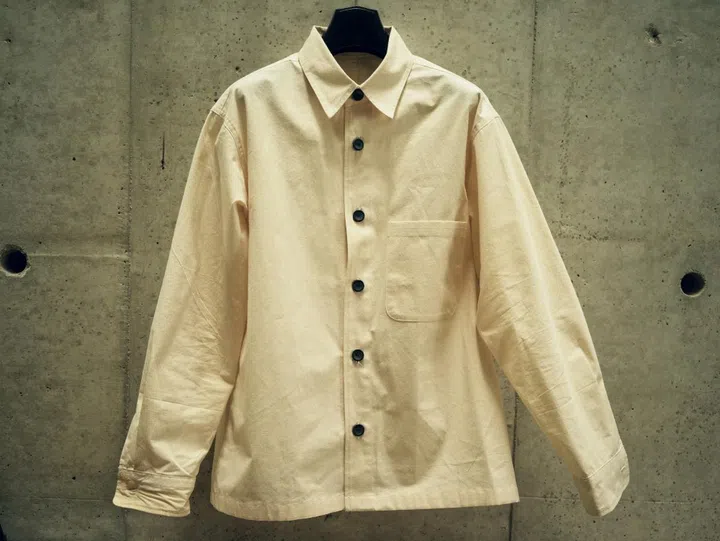 Architect and collaborator Jasper Chia tries on a sample shirt jacket from the upcoming collection.
