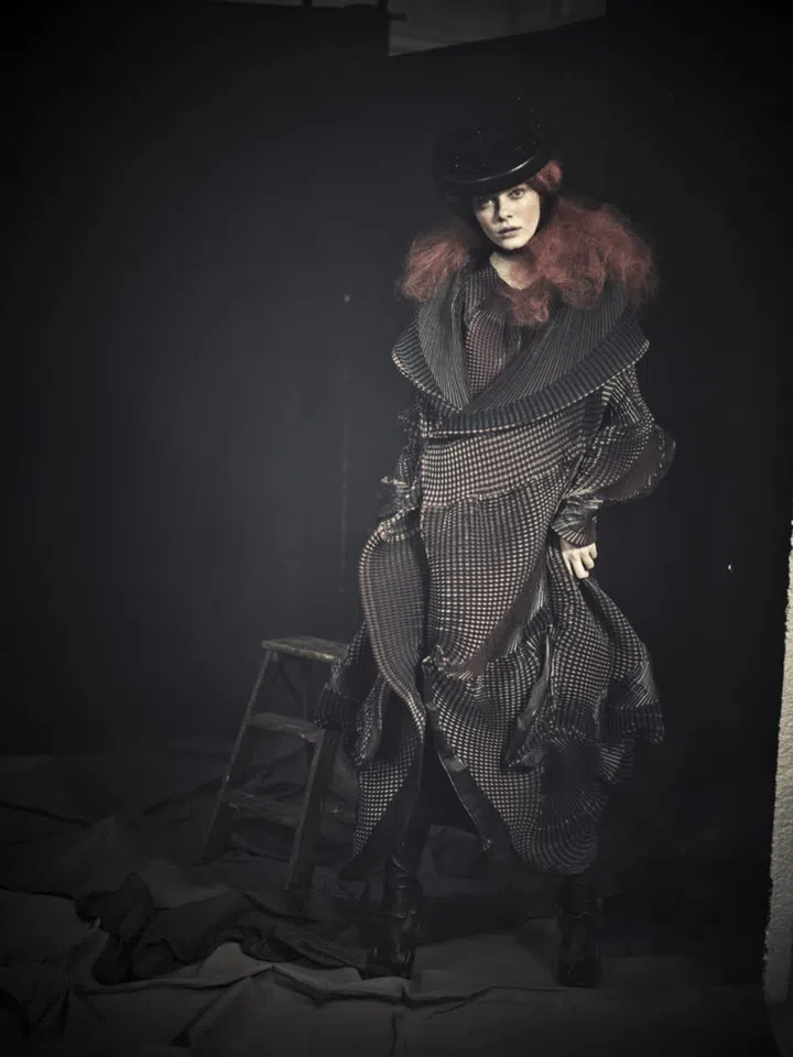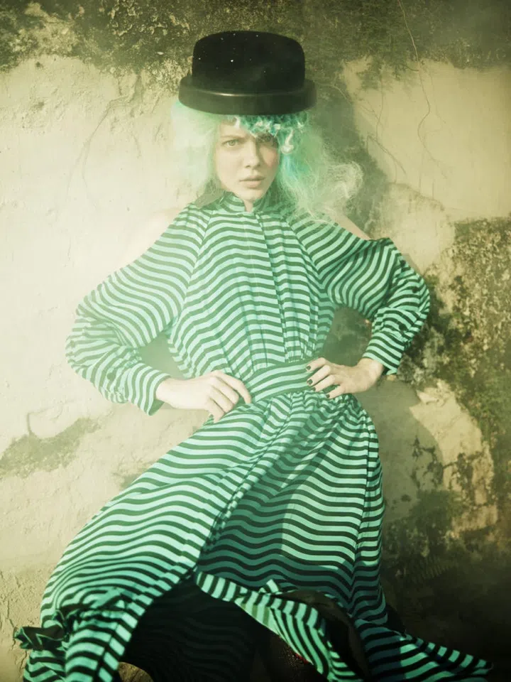 Cotton-blend shirt, Marni. Patent leather bustier and felt bowler hat, Emporio Armani. Embroidered nylon-blend circle skirt and leather platform boots, Marc Jacobs. Scarf (worn around head), stylist’s own