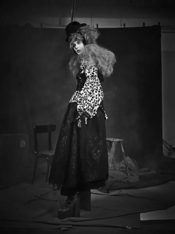 Silk brocade and velvet jacket, and matching tiered skirt, Comme des Garcons. Cotton shirt, Prada. Faux pearl chandelier earrings, Marni. Wool leggings, Prada