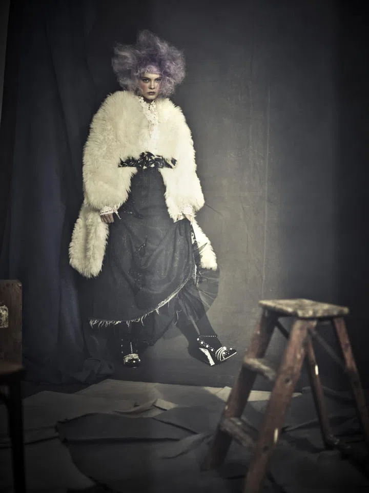 Chloe shearling coat, www.net-a-porter.com. Lace shirt, Lanvin. Denim skirt, Marc Jacobs. Leather, cotton and velvet belt, and cotton crochet gloves, Miu Miu. Suede T-bar pumps with faux pearls and crystals, Gucci. Petticoat, stylist’s own