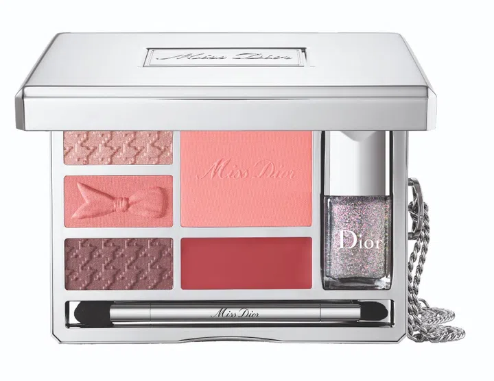 The new Miss Dior Palette is a re-imagination of the beloved Dior fragrance, Miss Dior. Created by Peter Philips, creative and image director for Dior Make-up, the palette features three eyeshadows embossed with the maison's signature houndstooth check and a cute dagger bow in delicate shades of pink; a lipstick with a satin finish; a long-wear blush engraved with "Miss Dior", a glittering top coat for nails, as well as a double-ended brush created exclusively for this model.