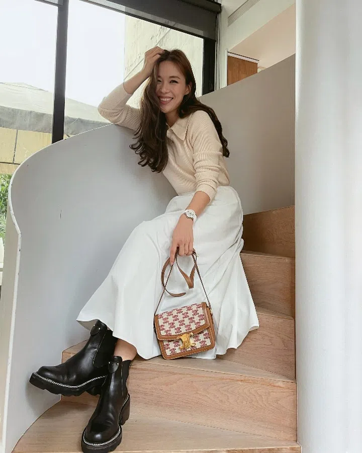 We're taking style notes from the Singapore actress by matching the Teen Triomphe handbag with a sweater, maxi skirt and combat boots to add a tough cool-girl edge to an otherwise feminine outfit.