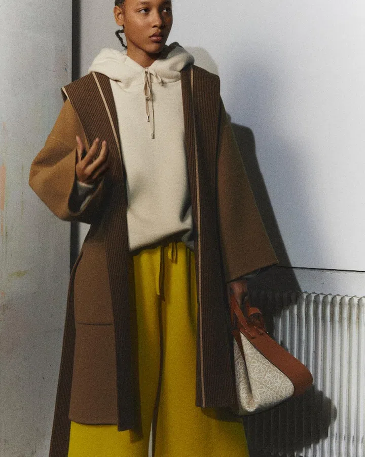 Inspired by this streetwear look? All you need is a hoodie, coloured trousers, a long cardigan and of course, a Loewe Hammock bag to complete the 'fit.