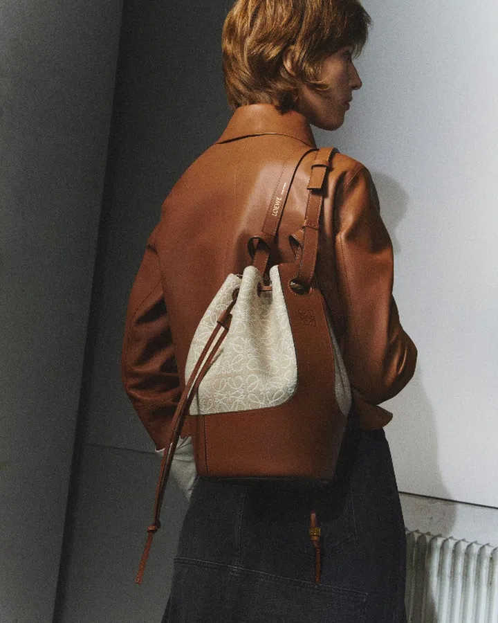 If you're enticed with the Anagram Jacquard family, the patterned canvas jacquard appears on the Balloon bucket bag, Hammock bag, and a new soft and boxy shape called the Cubi. Meanwhile, the Horseshoe saddlebag and Anagram tote make do with the repeated monogram design. Instead, the two bags comes in a plain canvas with a giant Loewe logo in the centre.