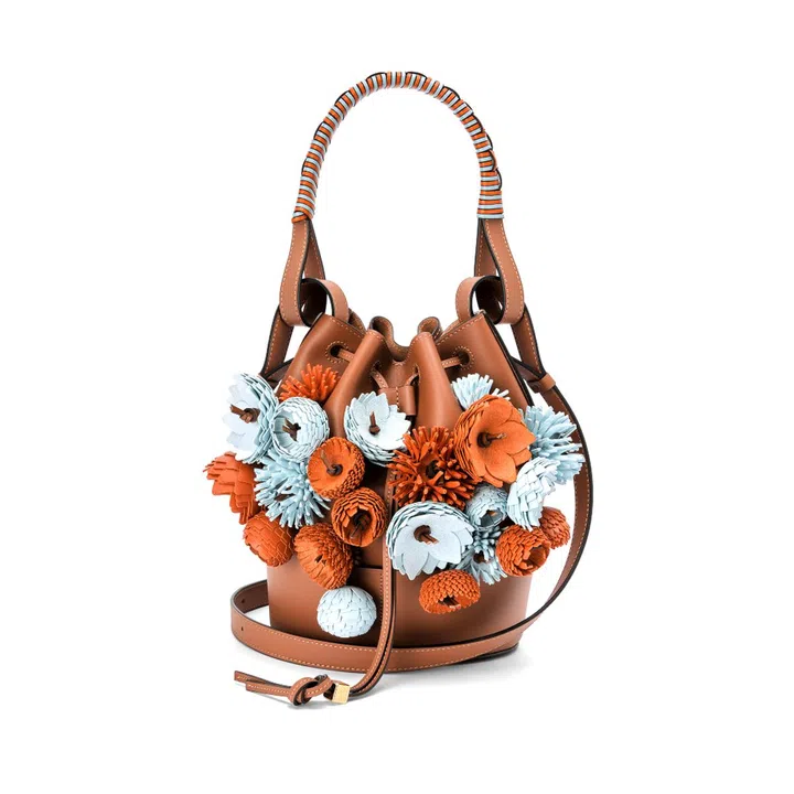 The brand’s sumptuously elegant take on a bucket bag, now transformed into works of art with handcrafted leather and raffia blooms as part of the Loewe Weaves collection.