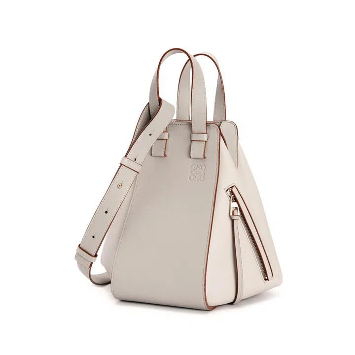 A half-moon-shaped bag that gets its name from the pin on its side; its asymmetrical, saddle-stitched knotted leather strap adding to its casual, arty charm.