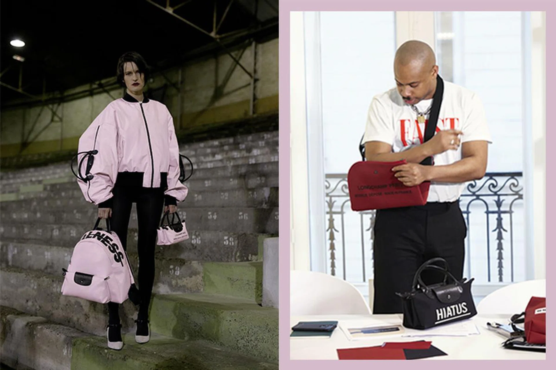 Key graphics used include the “Hiatus” logo, appearing on one side of Longchamp’s iconic Le Pliage, which has also been updated with dramatically elongated handles. “This came from the idea of having a bag that was more personal and having one bag that was more business,” explains Oliver. “TheHiatus side is meant for having fun and the other is more business. I was trying to make the Le Pliage consistent with this idea of the new world.”