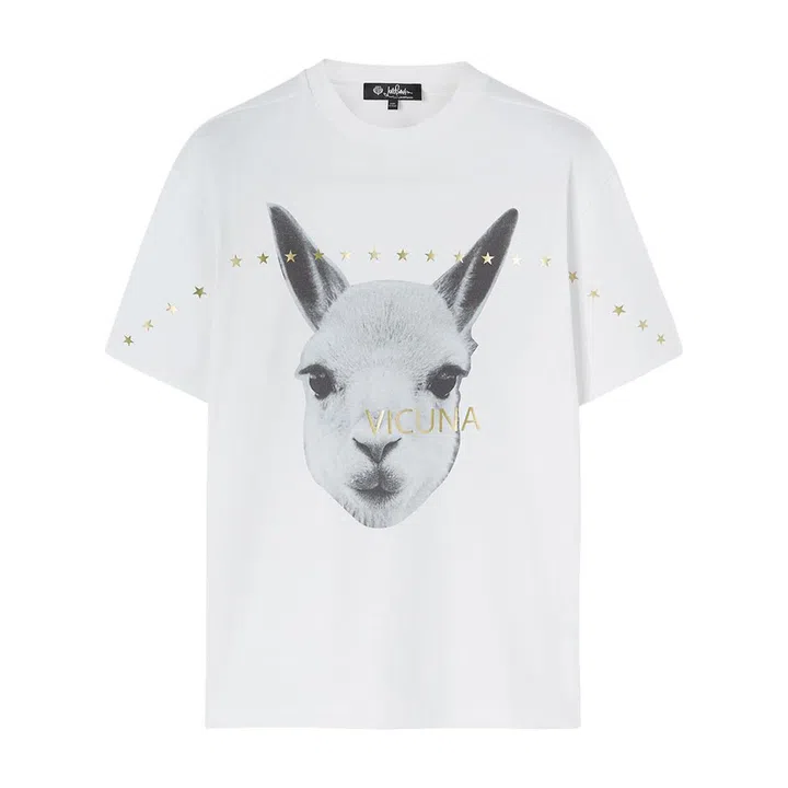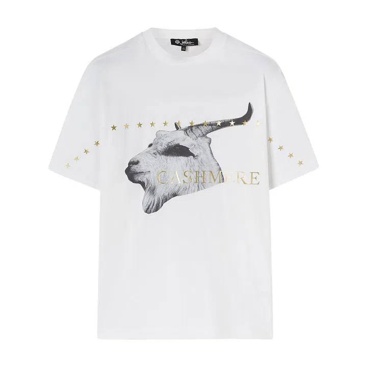 The goat on this T-shirt is the Capra hircus, which as the source of cashmere represents both Loro Piana's artisan approach and its commitment to preserving these animals and their habitats. The print is off-set with gold lamé and a large rendering of the grafitti-style logo created by Fujiwara on the back.