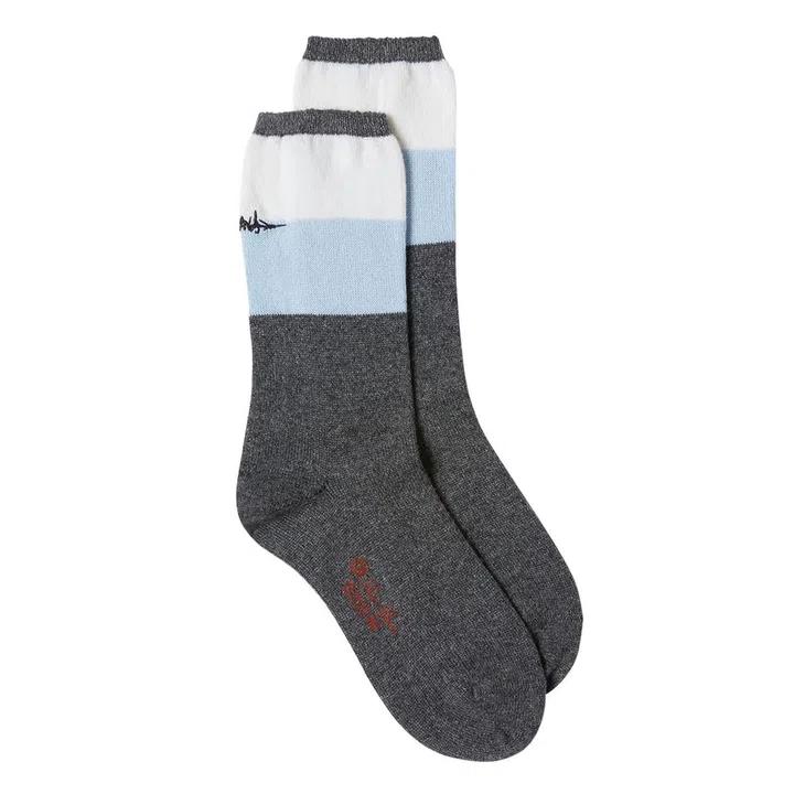 Press notes mention that this collaboration combines function with soft, cosy fabrics. A good example are these cashmere socks, which feature the reinterpreted Loro Piana logo on the back.