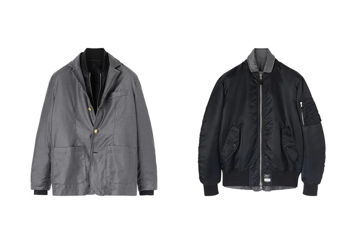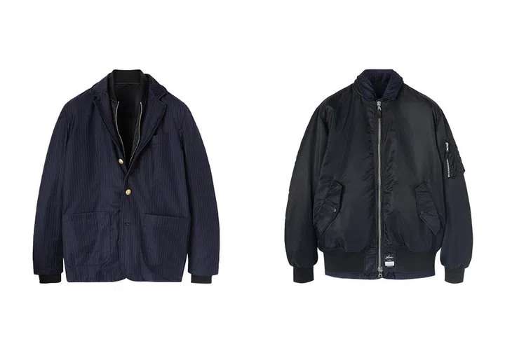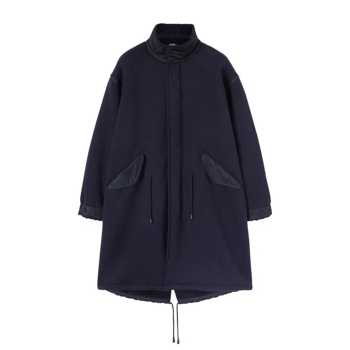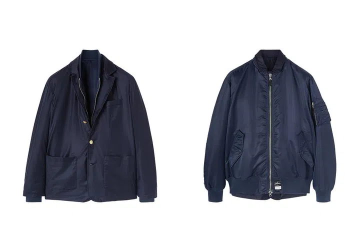 This reversible jacket perhaps best represents the meeting of two worlds in this collaboration. On one side, a Tasmanian wool jacket cut in a classic three-button single-breasted blazer; and on the other, a nylon military-inspired bomber jacket with a wool collar.