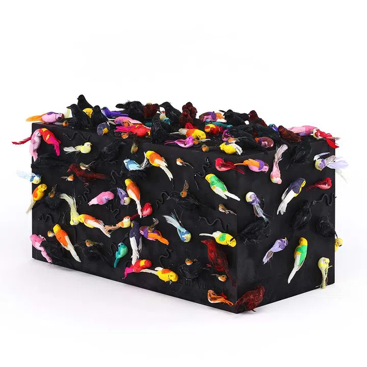 What: A black base to embody the stylist's experimental ideas, adorned by a flock of birds that look like they are returning to their nest