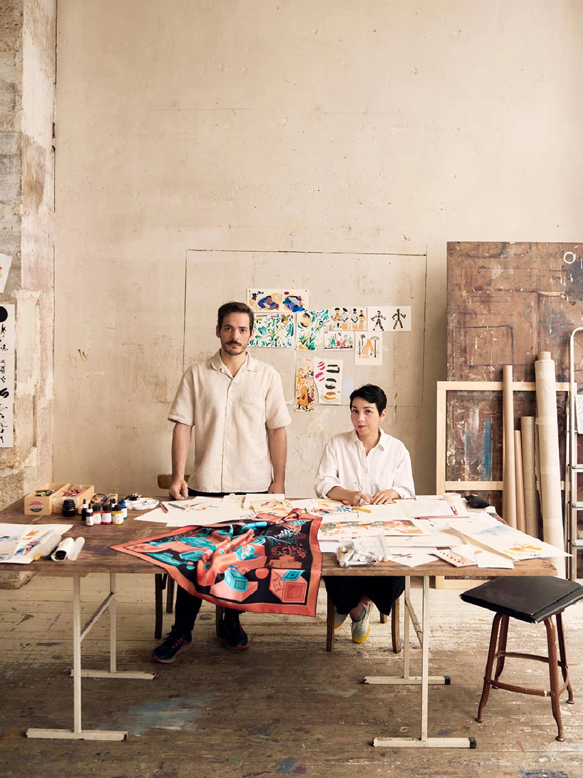 “Each project has its own path ... In this case, the silk square is a rare object heavy with history and meaning, and it could be weighed down with an iconic story. At the same time, it’s light and free, and is still just a colourful piece of fabric. We believe in the magic of labour – we work, and we exchange ideas and desires. Some are very carefully constructed and conceptualised, and this gives them a certain scholarly heaviness. We then take great pleasure in adding much more instinctive, playful and surreal elements. This back and forth between structure and a form of carefree, almost psychedelic nature is a recurring element in our work. There are two of us: Each of us has our own energy and complementary desires – when one is water, the other is mountain, and vice versa. We work slowly, at length. In the dark, we bang on the walls and sometimes end up finding an opening into a small, unknown world. We can only describe it as one that has been patiently waiting for us.”