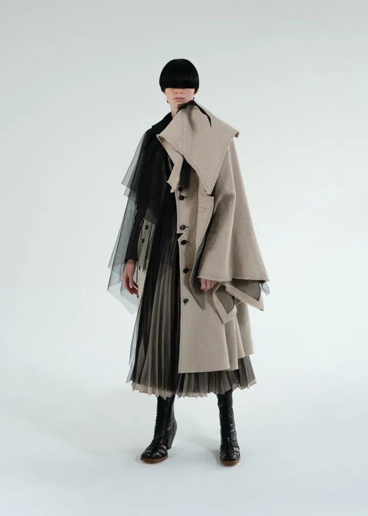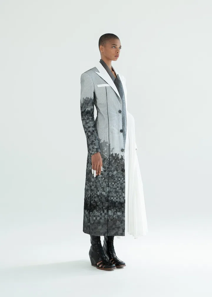 An oversized shirt has been deconstructed to create asymmetrical pants with a sweeping leg, while a couture-esque opera coat and carrot-shaped cropped pants are fashioned out of a mosaic print fabric that looks vintagey from afar and futuristic up-close.