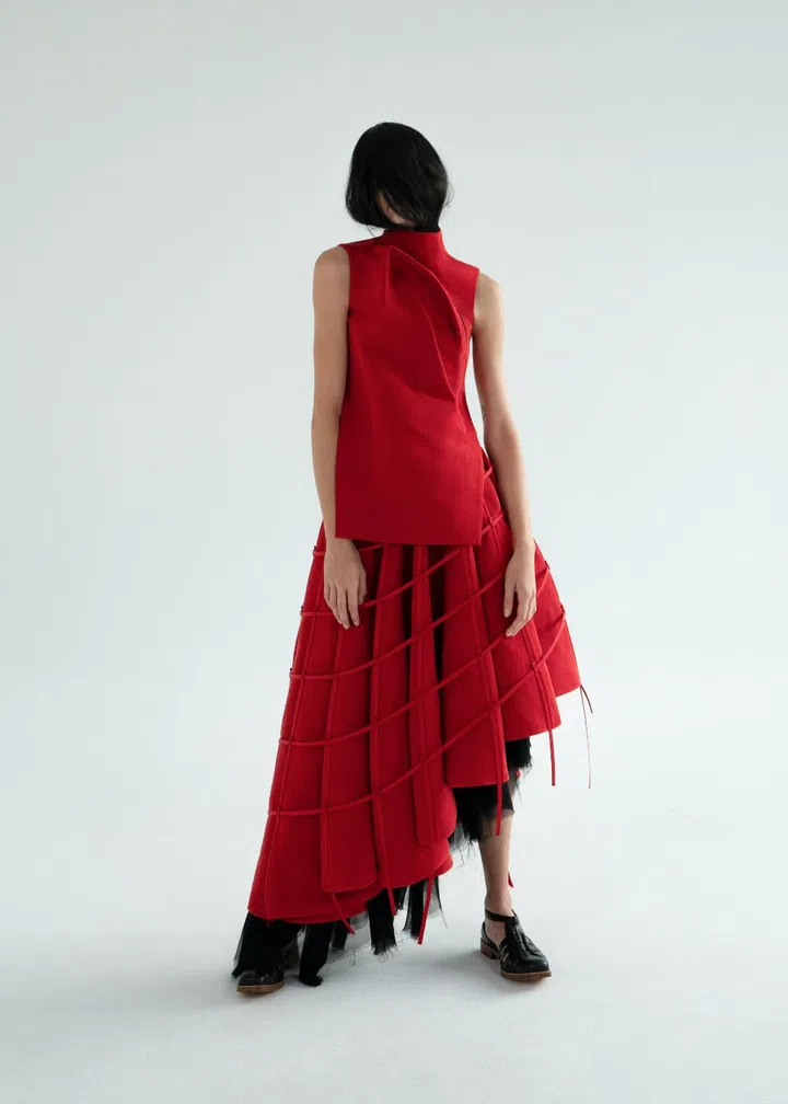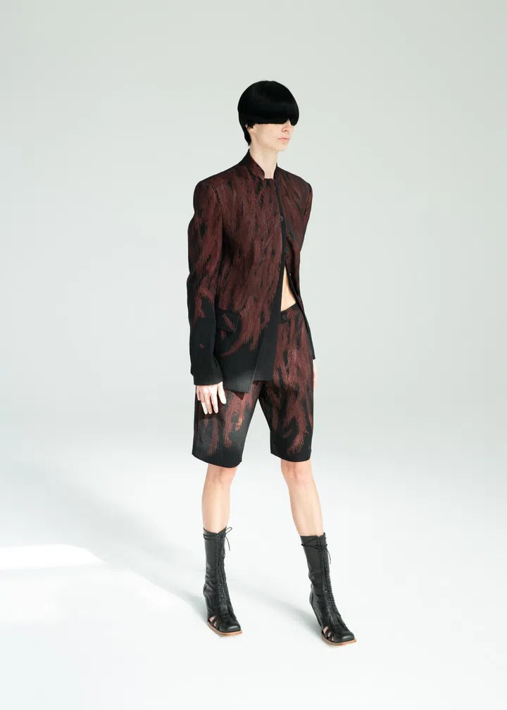 One blazer, for example, is made from the fusion of manipulated wool and chiffon – two drastically different materials – and features a single red feather spread out and quilted down the spine, making for an intriguing detail.