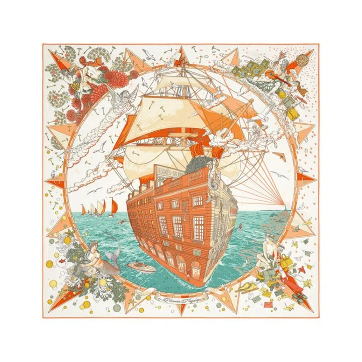 The Hermes Flagship scarf 90cm in silk twill, designed by Dimitri Rybaltchenko, from the S/S 2024 Objets collection.