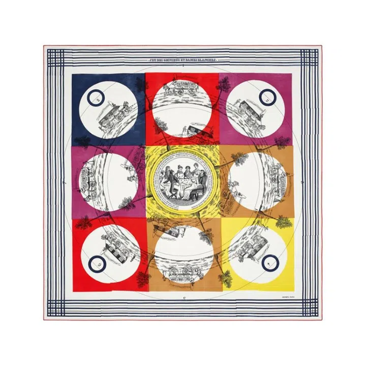 Hermes scarves have been coveted as objets d’art for nearly 90 years now, and a significant part of their allure stems from the whimsical and liberated nature of their designs. Its first scarf, the Jeu des Omnibus et Dames Blanches, featured a design inspired by a popular board game in the 1930s, depicting multi-coloured horse-drawn carriages surrounding a central image of ladies sitting around a table. Hermes’ then-primary designer, Hugo Grygkar, on just one piece of fabric, encapsulated the brand’s universe of equestrianism and leisure.