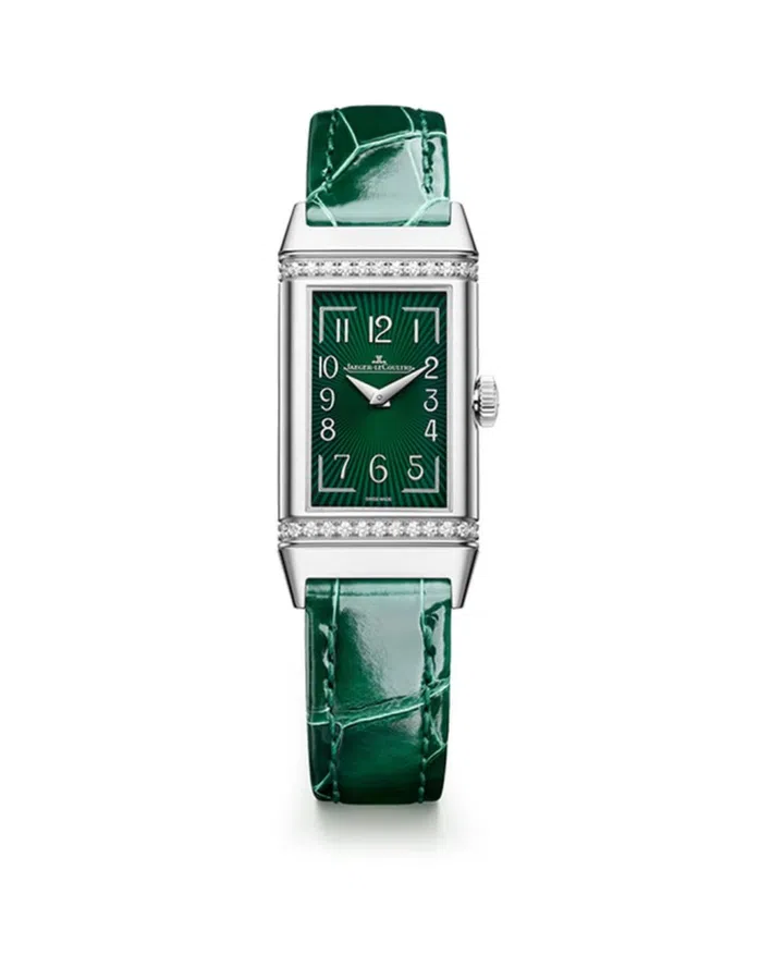 Inspired by the elongated models of the 1930s, Jaeger-LeCoultre’s Reverso One is a stunning blend of grace and durability. This Art Deco timepiece features signature elements of the brand, including gadroons on the rectangular case and a reversible design that reveals either a polished stainless steel caseback or a beautifully lacquered lush green dial that complements the alligator straps. The diamonds set into the gadroons add an extra touch of elegance, making it a worthy addition to any luxury watch collection.