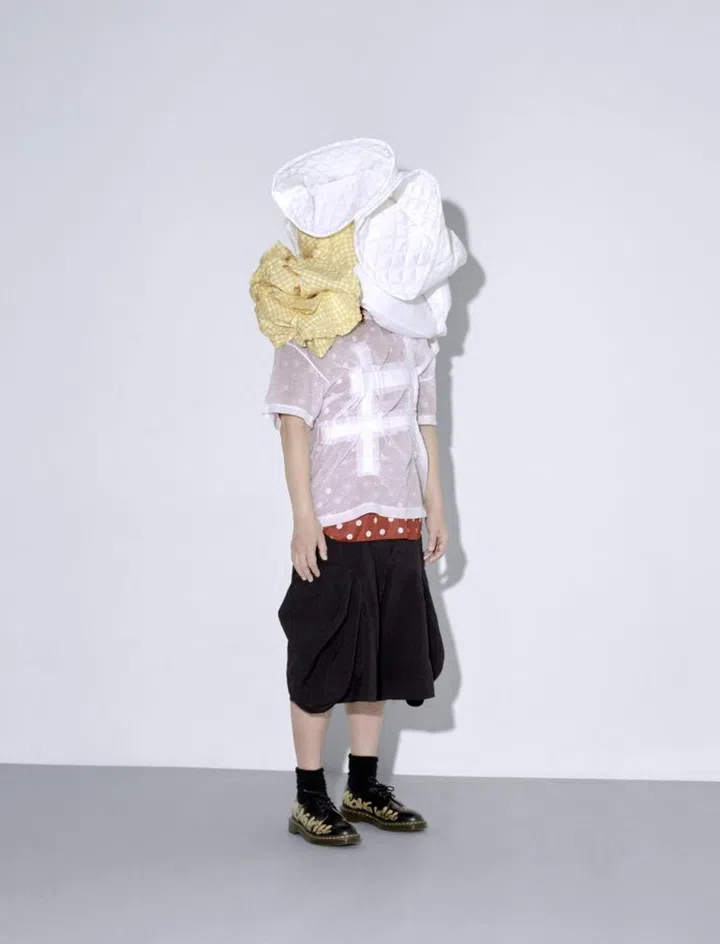 Ho wears his own T-shirt, shirt, shorts, socks, derbies, and various tops and shorts worn as headpiece, all from Comme des Garcons and its various lines.