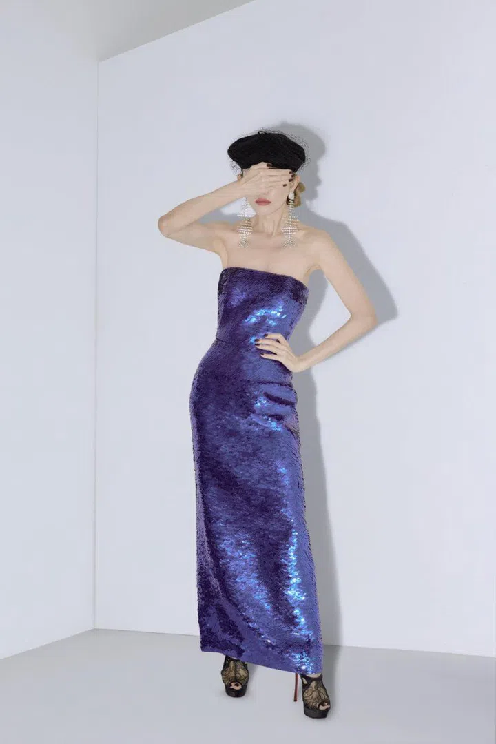Wendy wears her own Oscar de la Renta gown, Dior beret, Saint Laurent By Anthony Vaccarello earrings, and Christian Louboutin platform sandals.