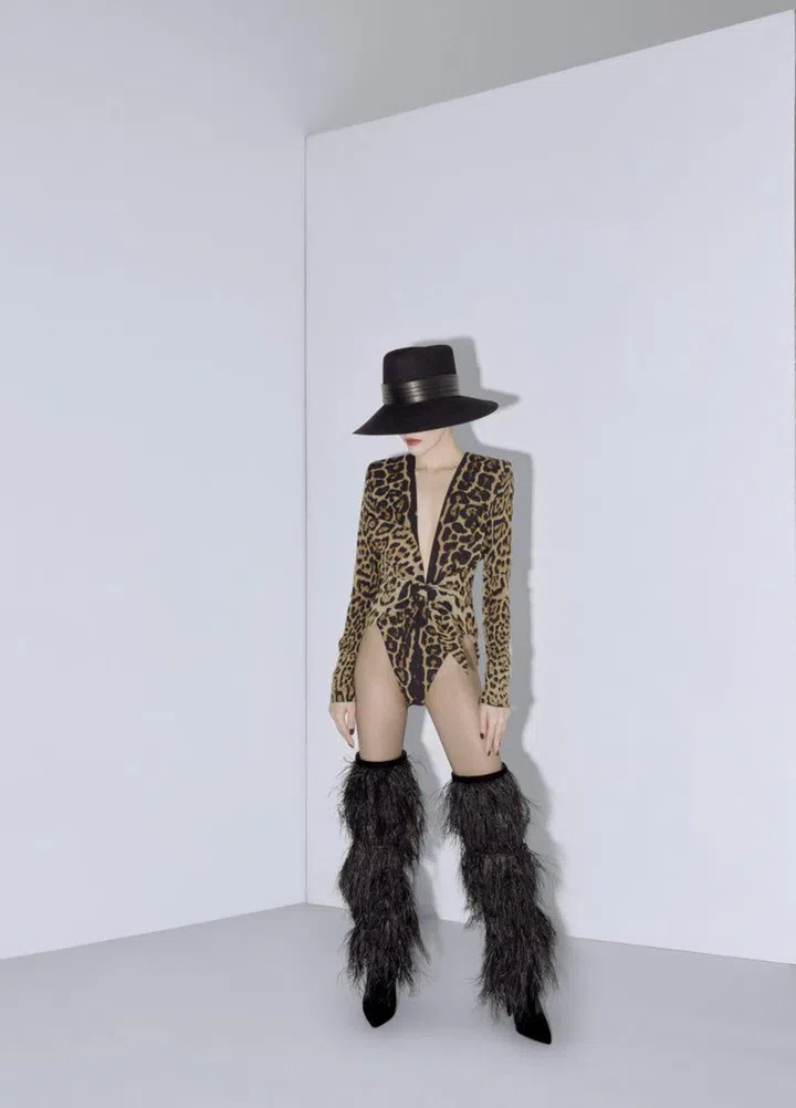 Wendy wears her own Saint Laurent By Anthony Vaccarello hat, bodysuit and boots