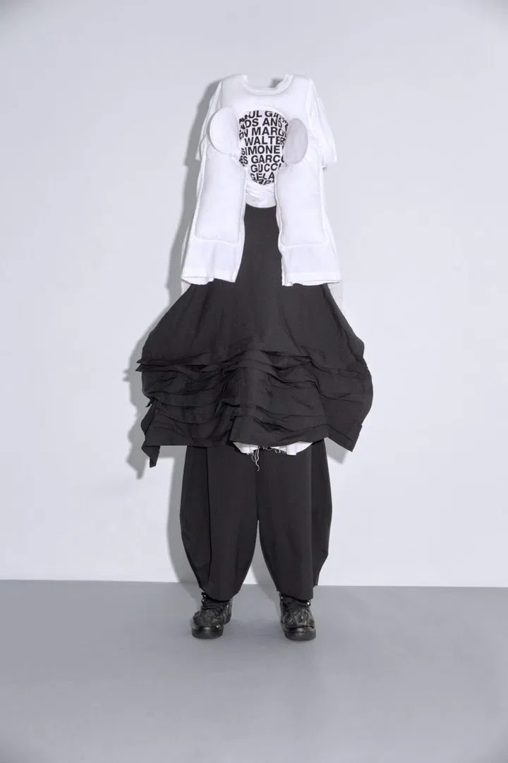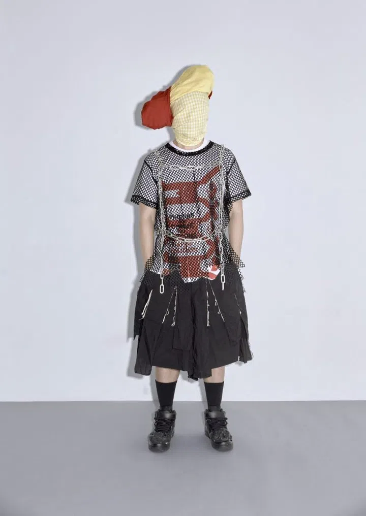 Ho wears his own T-shirts, shorts, various T-shirts worn as headpiece, harness, socks and sneakers. All from Comme des Garcons and its various lines.