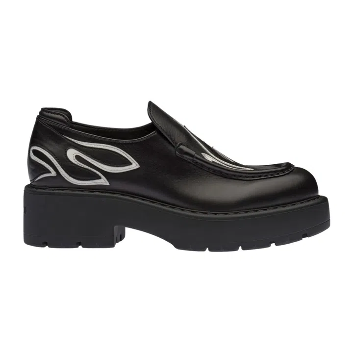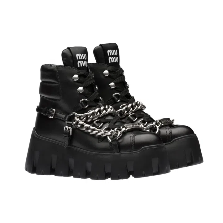 One of the season’s key footwear styles, the Splitboard boots, is inspired by those used for splitboarding – an off-shoot of snowboarding. Its hooks and eyelets are similar to those on trekking shoes; its chain embellishments an ode to Run DMC style; and its chunky soles are made from an innovative EVA material so that they’re exceptionally light.