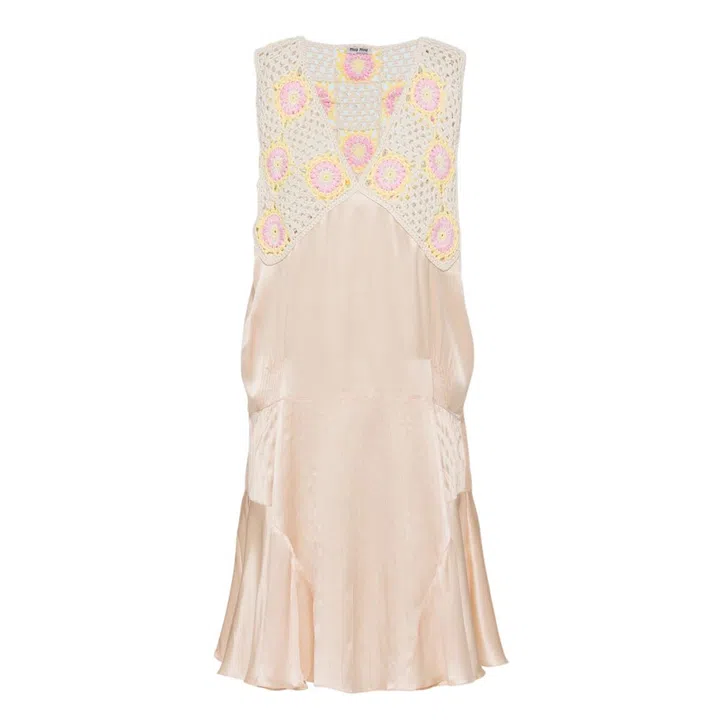 Wool crochet jacket, matching pullover and ski mask, satin and wool crochet dress, wool tights, Splitboard calf leather boots with metal chain and Miu Belle nappa leather clutch with metal chain strap