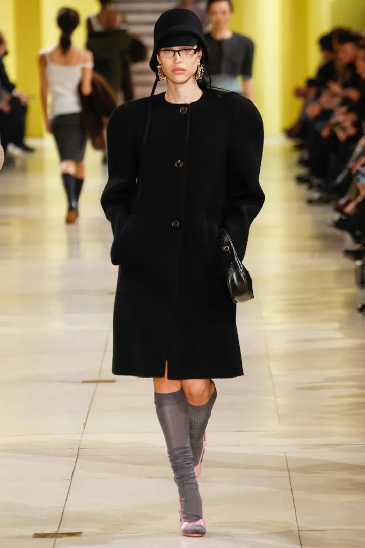 The signature Mrs Prada twist was felt more in the styling gestures and accessories - the straps on the lingerie dresses worn askew, dresses opening up to reveal decolletage (and those satin bullet bras of course), kooky glasses, and extra-long mannish loafers.