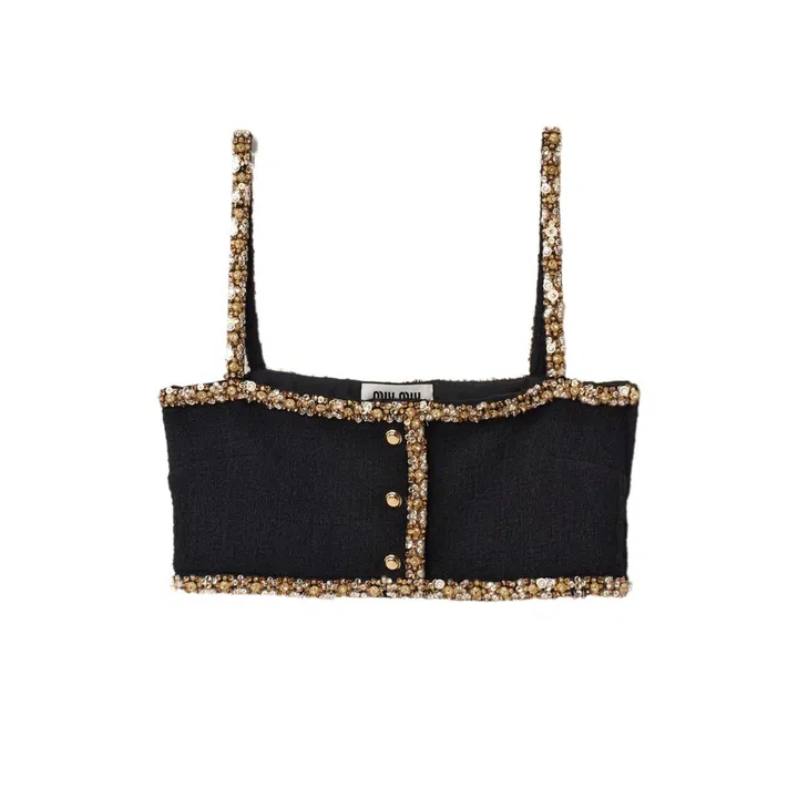 Sneak a little party into your attire with this tweed top adorned with shimmering trim and details.