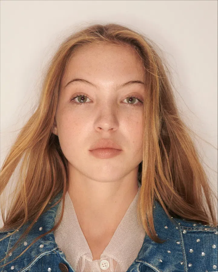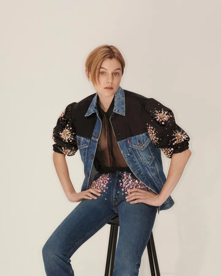 Lila Moss in Levi's X Miu Miu denim jacket, $8,900 and Levi's X Miu Miu denim jeans, $6,600