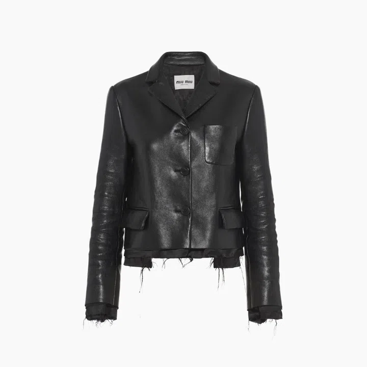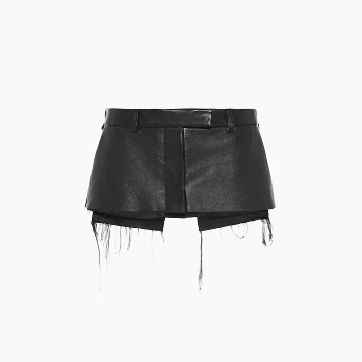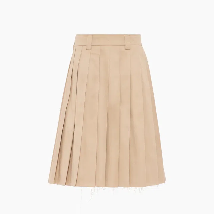 As for the frayed edges? Miuccia Prada has intentionally left them raw to expose "elements of construction" and to imply the spontaneity of taking a pair of scissors to chop off an erstwhile prim and proper skirt in order to reveal the body.