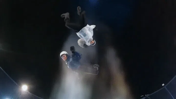They were greeted by the sight of 12 performers dressed in pieces from the collection performing gravity-defying manoeuvre above three wind tunnels, as the city's neon-lit skyscrapers beckon in the background.