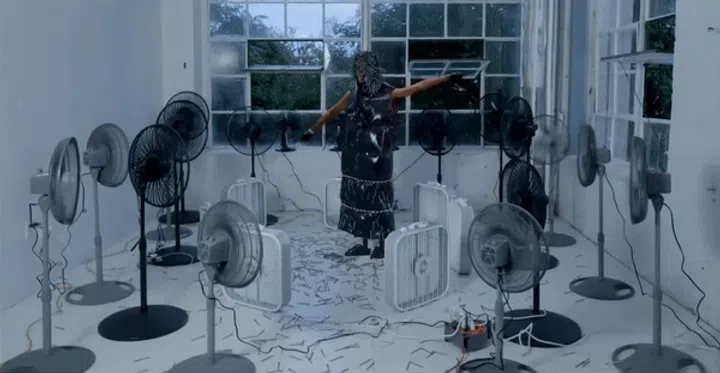The musician, known for his trademark wig of nails, debuted his new single I'm Just A Fan with a set that bordered on the surreal. The rapper, who was dressed in a coat by Williams, was surrounded by 30 electrical fans as he crooned. Pieces of nails started falling off his head along the way as his arms started whirring.
