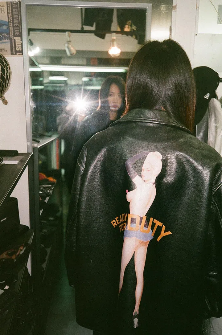 Yuan sporting a rare Yohji Yamamoto leather jacket find in Osaka-based vintage store, La Grande Lue.
