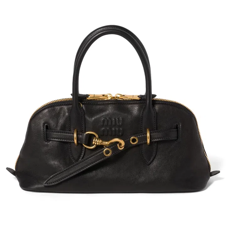 What you need to know: The Aventure top-handle bag, revived from the Miu Miu archives, has been reimagined with a lighter structure and a fresh, modern attitude, combining classic design with cool vintage charm. Perfectly made for day, it features leather handles, a detachable and adjustable leather shoulder strap, antiqued gold-tone hardware, and an embossed logo on the front.