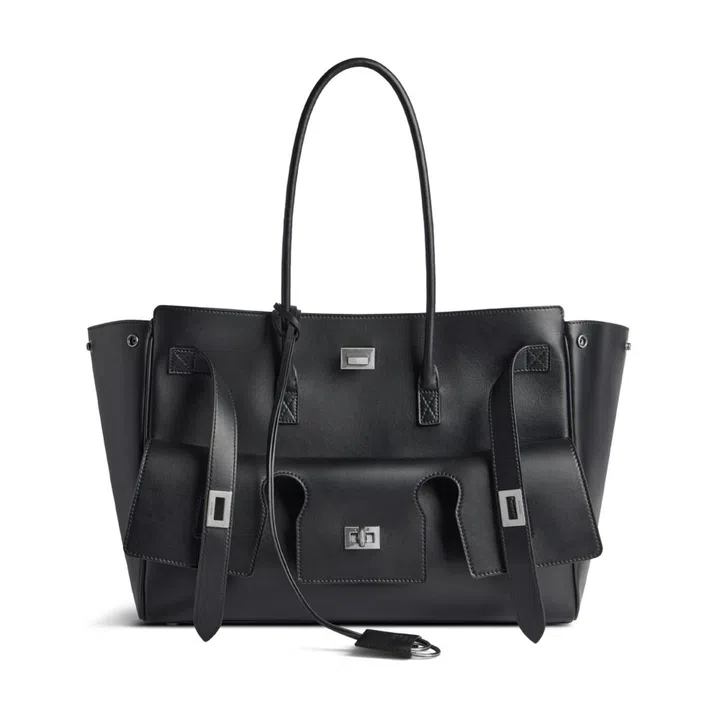 What you need to know: Named after the leafy Los Angeles neighbourhood, the Bel Air Bag follows in the footsteps of the Beverly Hills-inspired Rodeo Bag. Its relaxed tote design features smooth leather that develops a grained patina over time, complemented by a soft nappa lining. Subtle Balenciaga Paris stamps are embossed on the back, interior, and removable keyring. The bag’s standout feature is a logo-engraved metal twist lock that secures two slender belts across the front.