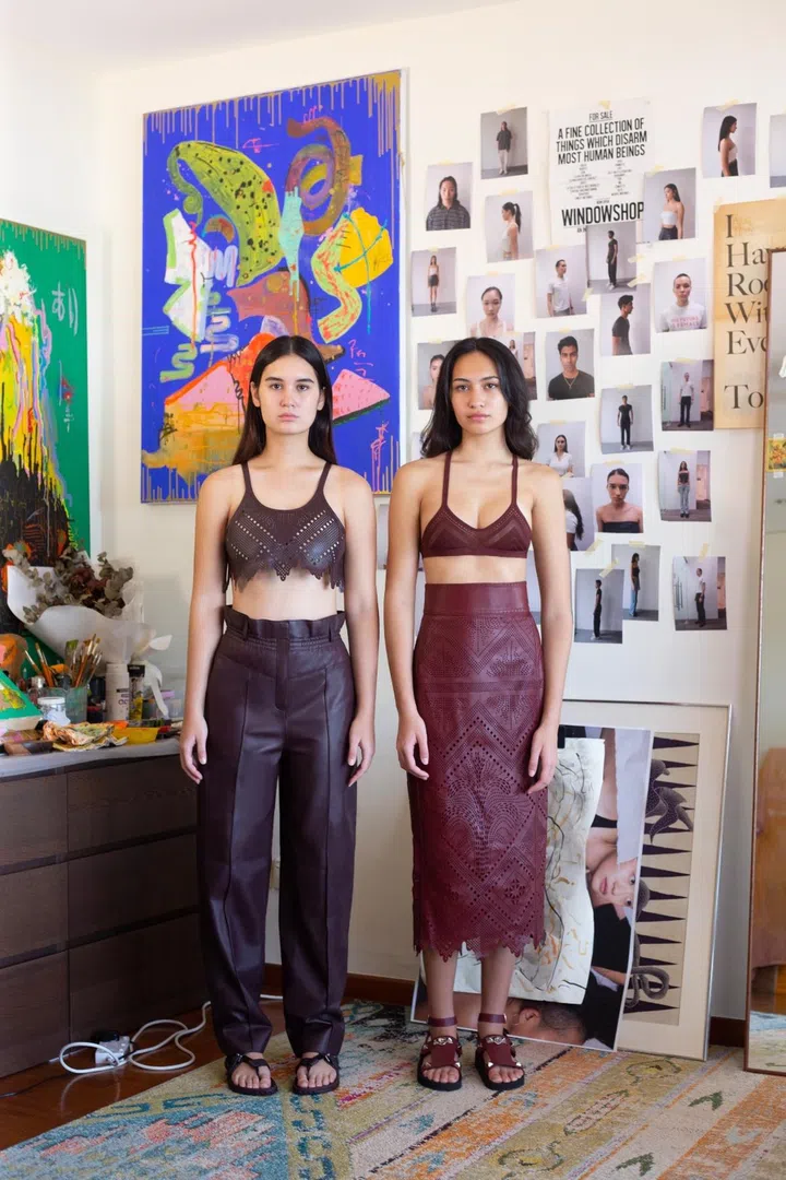 On left: Aisha wears perforated lambskin crop top, lambskin pants, and calfskin sandals wit canvas ribbons. On right: Latisha wears technical silk mesh bra top, perforated lambskin skirt and calfskin sandals. All Hermes