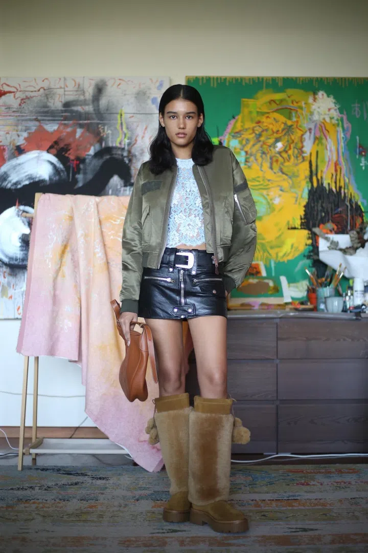 Charleigh wears Celine by Hedi Slimane nylon twill cropped bomber jacket, embroidered lace crop top, lambskin mini skirt, Marco calfskin belt with strass, Heloise Cuir Triomphe calfskin hobo bag, and Bulky shearling and suede calfskin boots with matching tassels, Celine