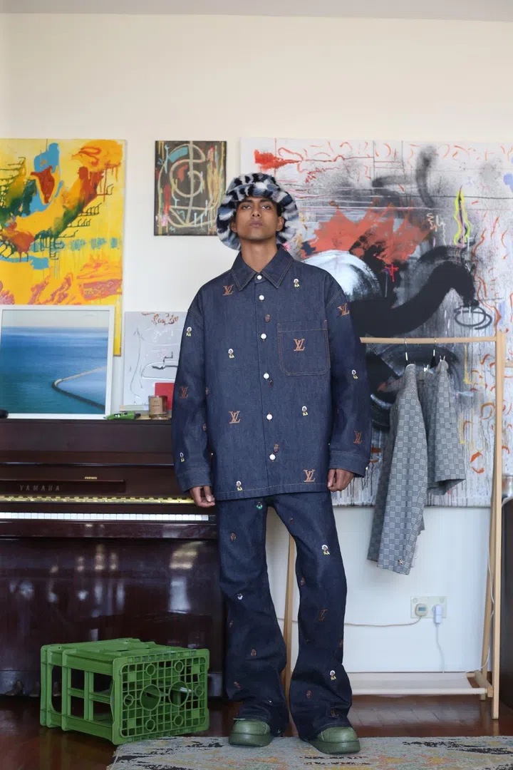 Silas wears denim shirt, matching pants and LV Trainer Maxi calf leather sneakers, Louis Vuitton. Hat, stylist’s own