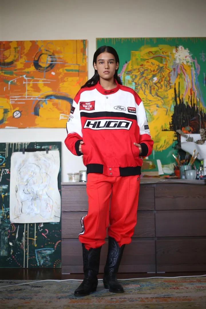 Charleigh wears cotton jacket and polyester blend pants, Hugo. Boot, stylist’s own