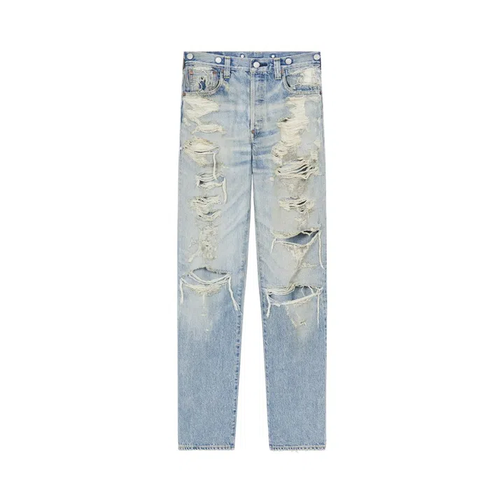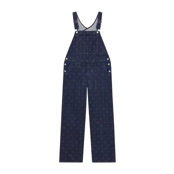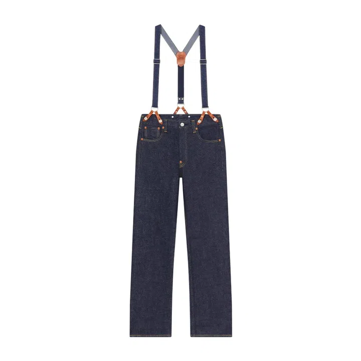 As for the dungarees? These come in two variations. One is a deep indigo rinse, and the other features a trompe l’oeil Sashiko print. The well-loved Levi’s 501 model encompasses a vintage-washed denim version, meticulously distressed by hand in Japan. Additionally, there is a rinse indigo denim iteration with leather and denim suspenders, drawing inspiration from the original 501s which were introduced in 1933.
