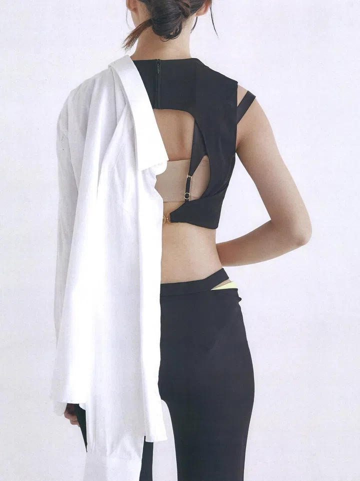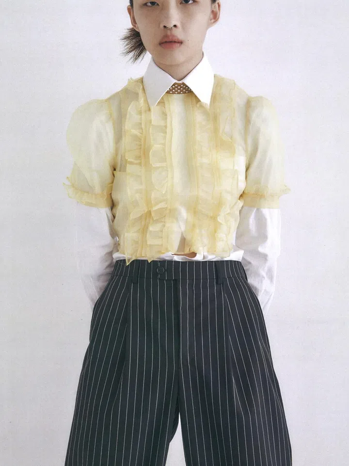 Embroidered organza top, Miu Miu. Celine by Hedi Slimane wool pants, Celine. Shirt, stylist’s own