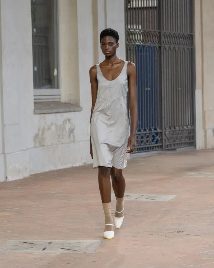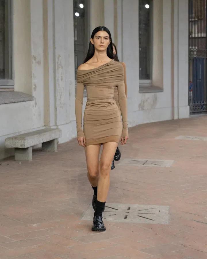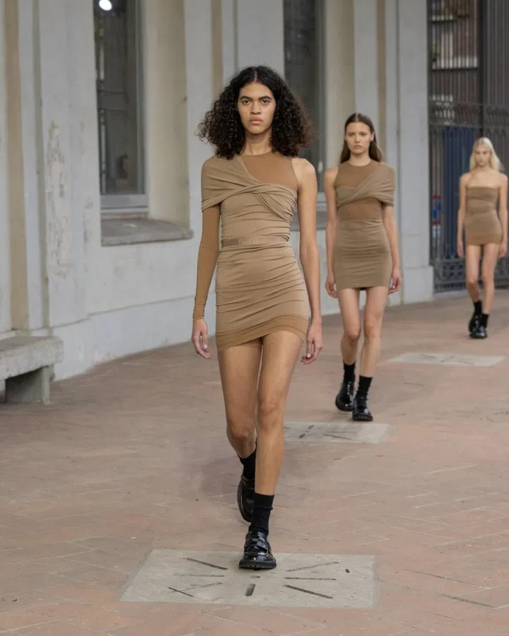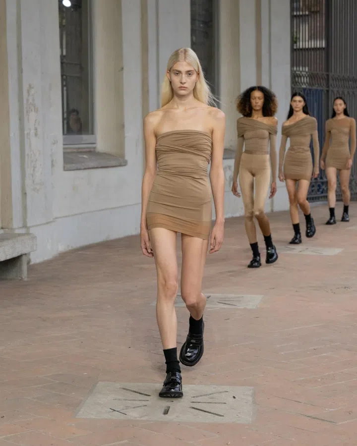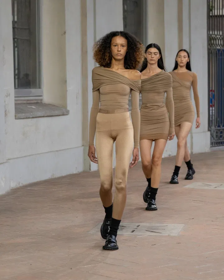 In a fascinating collaboration, Onitsuka Tiger has partnered with Wolford, the renowned maker of stockings and bodysuits, to create a capsule collection featuring skin-to-skin dresses, draped tops, and an array of nude-toned stockings that could easily give Skims a run for its money.