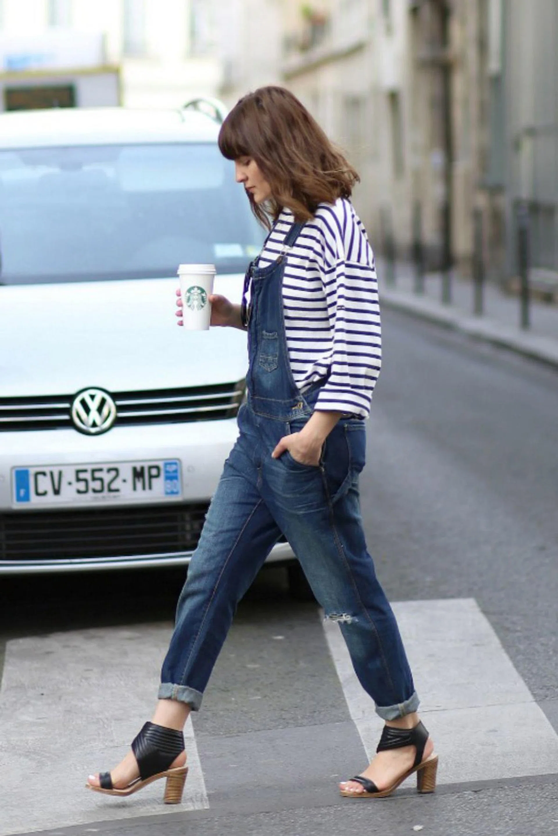 A Breton top can do no wrong, like Aurélia of Absolutely Glamorous. Whether you prefer your top looser like Aurélia’s, or more fitted, we’d also add a pop of red lipstick too. Stacked heels, a to-go cup (make sure it’s reusable!) will help that too-cool-to-care vibe.