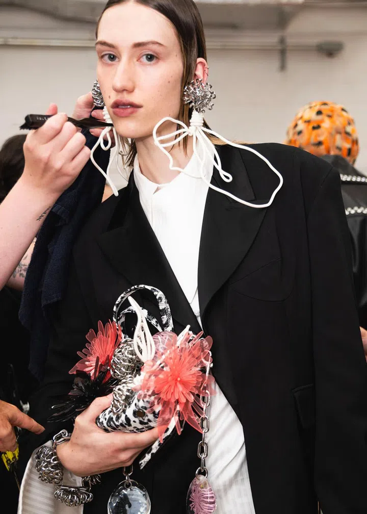 An oversized tuxedo suit with an ultra‐high waist and what Palomo calls “Brutalist shoulder pads” has whiffs of Marlene Dietrich, while leopard prints turn up on lapels and bags as well as all over coats and 1930s‐esque coats and gowns.