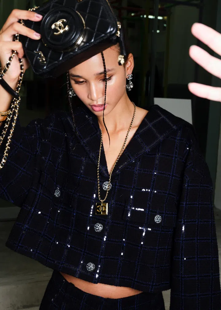 Iman wears tweed jacket with sequins and jewelled buttons, cotton knit top and matching skirt, cotton and polyamide tights, lambskin crossbody bag on metal chain and leather strap, and cotton Mary Jane flats, Chanel