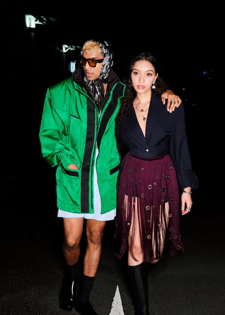 Raja (left) wears recycled nylon jacket, cotton shorts, Symbole acetate sunglasses and leather loafers, Prada; and his own scarf (worn on head) and socks. Huda (right) wears wool blazer and matching shorts, and wool and acetate skirt with brass eyelets, Prada; and her own jewellery and boots