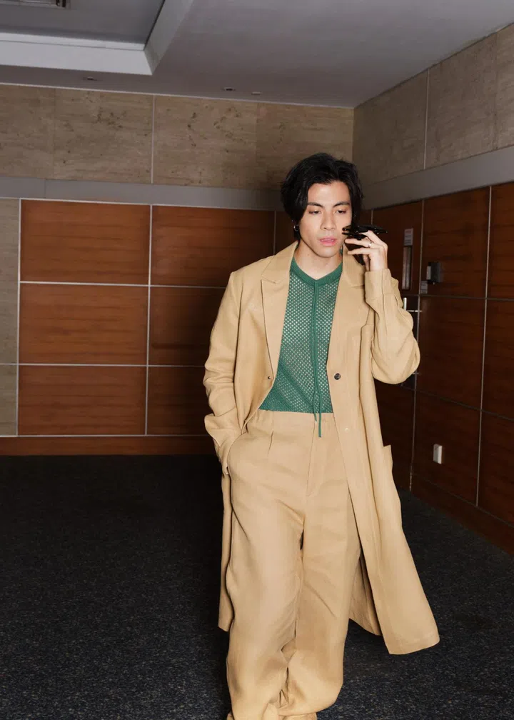 Benjamin wears canvas overcoat and matching pants, and wool mesh top, Fendi; and his own earring and ring. Helux O Matter and acetate sunglasses (held in hand), Oakley